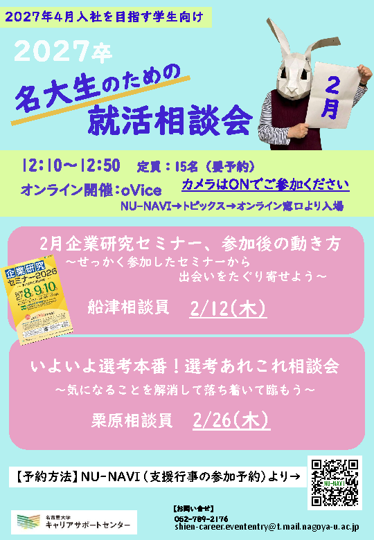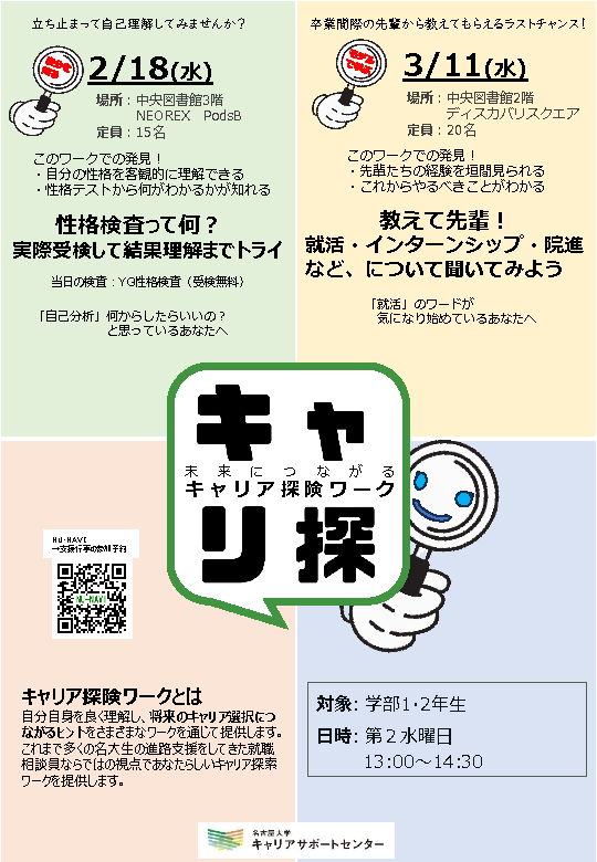 名古屋大学のキャリアサポートセンターでは、学生の就職活動の支援を中心に展開しています。名大生専用の合同企業説明会やインターンシップの説明会等を企画運営すると共に、個別相談の対応やキャリア教育としてのワークショップも提供しています。