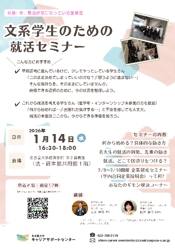 名古屋大学のキャリアサポートセンターでは、学生の就職活動の支援を中心に展開しています。名大生専用の合同企業説明会やインターンシップの説明会等を企画運営すると共に、個別相談の対応やキャリア教育としてのワークショップも提供しています。