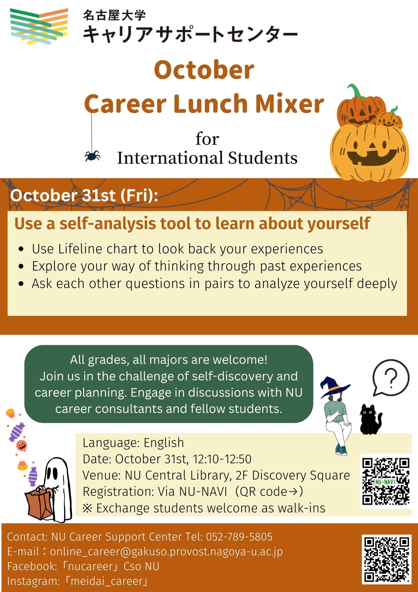 Career Lunch Mixer 2021.4.1 For International students October 24th (JPN) and 31st (ENG)12:15~12:55 Central Library 2F, Discovery Square Feel Free to join us!