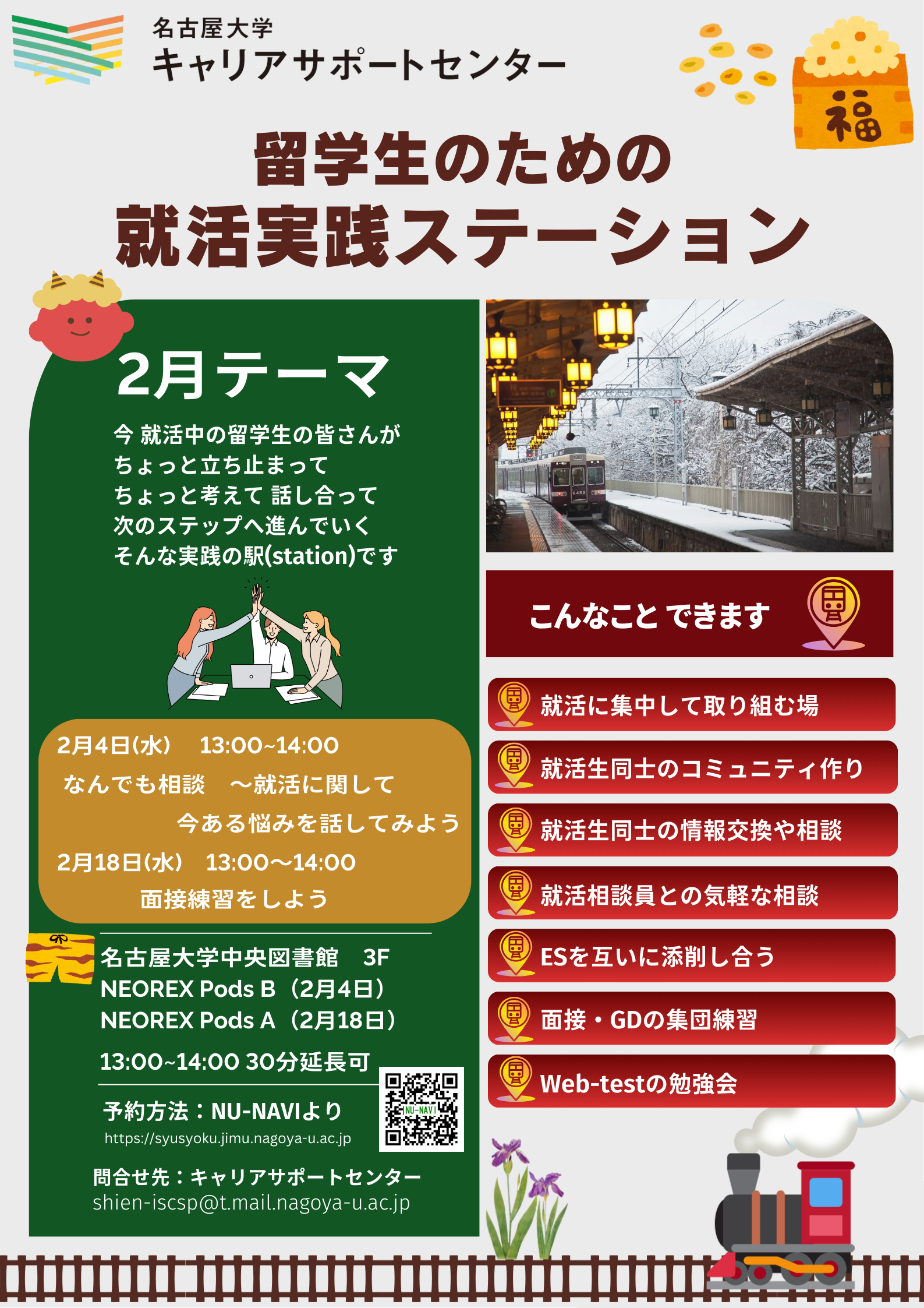 留学生のための就活実践ステーション 2024.1.16 留学生のための就活実践ステーションShukatsu Station for Intl. Students February 4th (NEOREX Pods B) February 18th (NEOREX Pods A)13:00-14:00 Central Library 3F, NU Waiting for your participation!