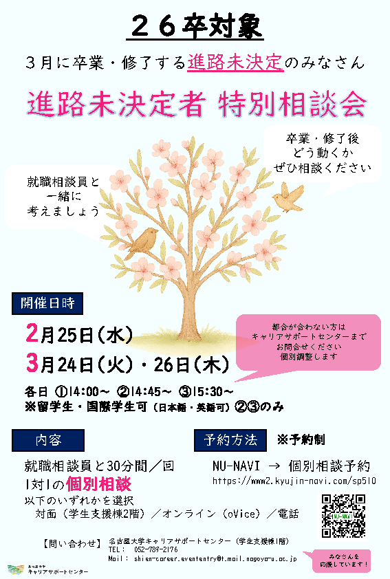 ... 2026.1.29 Special career consulting times available for 2026 March Graduates! Feb.25(Wed), Mar.24(Tue), Mar.26(Thu)①14:45~ ②15:30~