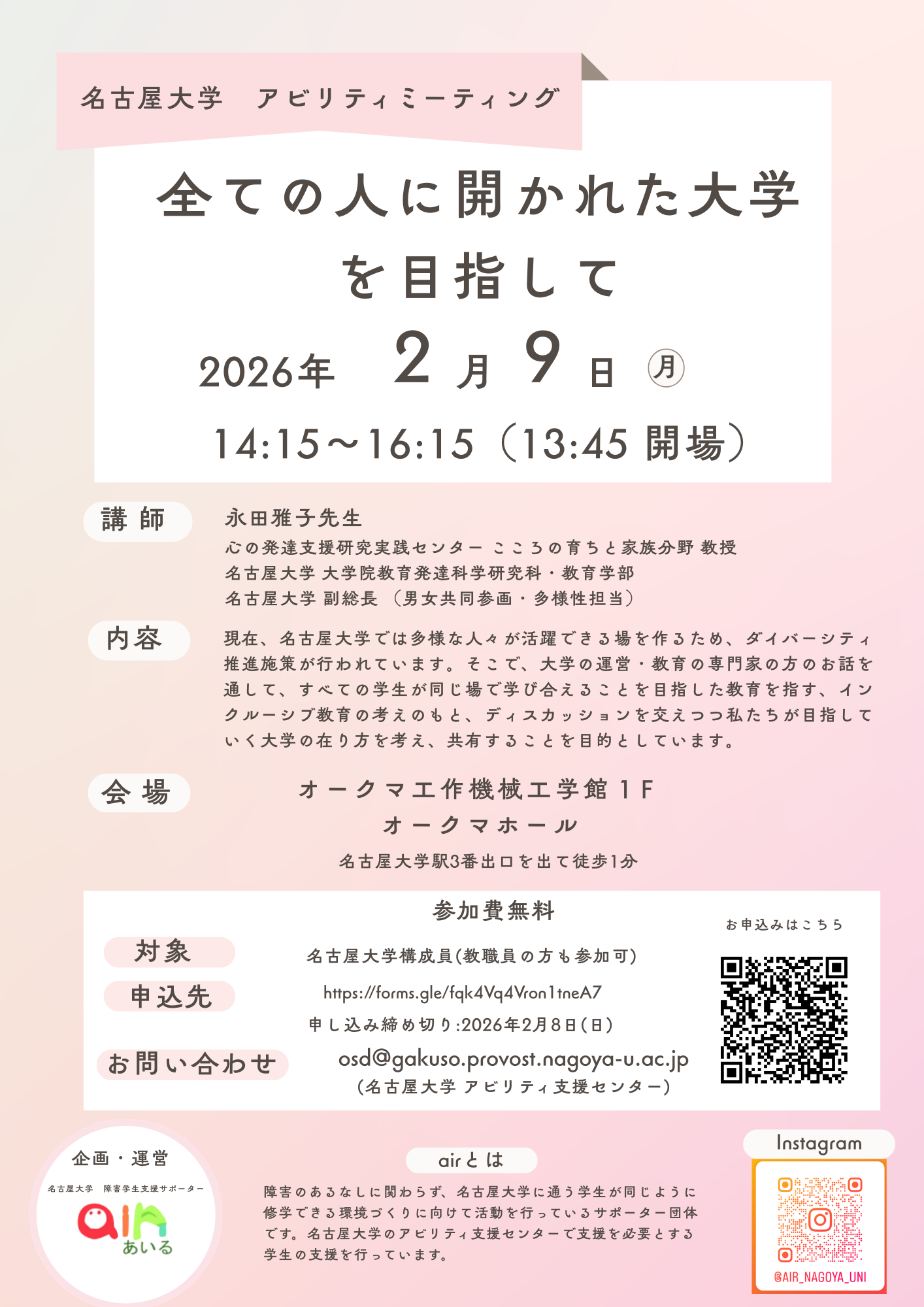 お知らせ 2026年1月19日1/23(金)13:00~障害理解を深める映画鑑賞会開催 映画の鑑賞とその後のディスカッションを通して、障害、それを取り巻く環境、人生などについて学びます。今回鑑賞する映画は、「サウンド・オブ・メタル~聞こえるということ~」です。途中参加、途中退室もOKです! 2026年1月15日2/9(月)14:15~16:15「アビリティミーティング」開催 「全ての人に開かれた大学を目指して」をテーマに、名古屋大学アビリティミーティングを開催します。永田雅子先生をお迎えし、ダイバーシティ推進やインクルーシブ教育の視点から、これからの大学の在り方についてお話しいただきます。 講演とディスカッションを通して、誰もが学びやすい大学づくりについて共に考える機会です。(申し込み先) https://forms.gle/fqk4Vq4Vron1tneA7 2025年12月19日12/27(土)~1/4(日)閉室 年末年始は閉室します。 2025年11月27日12/1(月)10:20~「障害理解を深める映画鑑賞会」開催 映画の鑑賞とその後のディスカッションを通して、障害、それを取り巻く環境、人生などについて学びます。途中参加、途中退室もOKです! 2025年10月27日広報誌「ってかair12号!?」発行 これまでのお知らせを見る