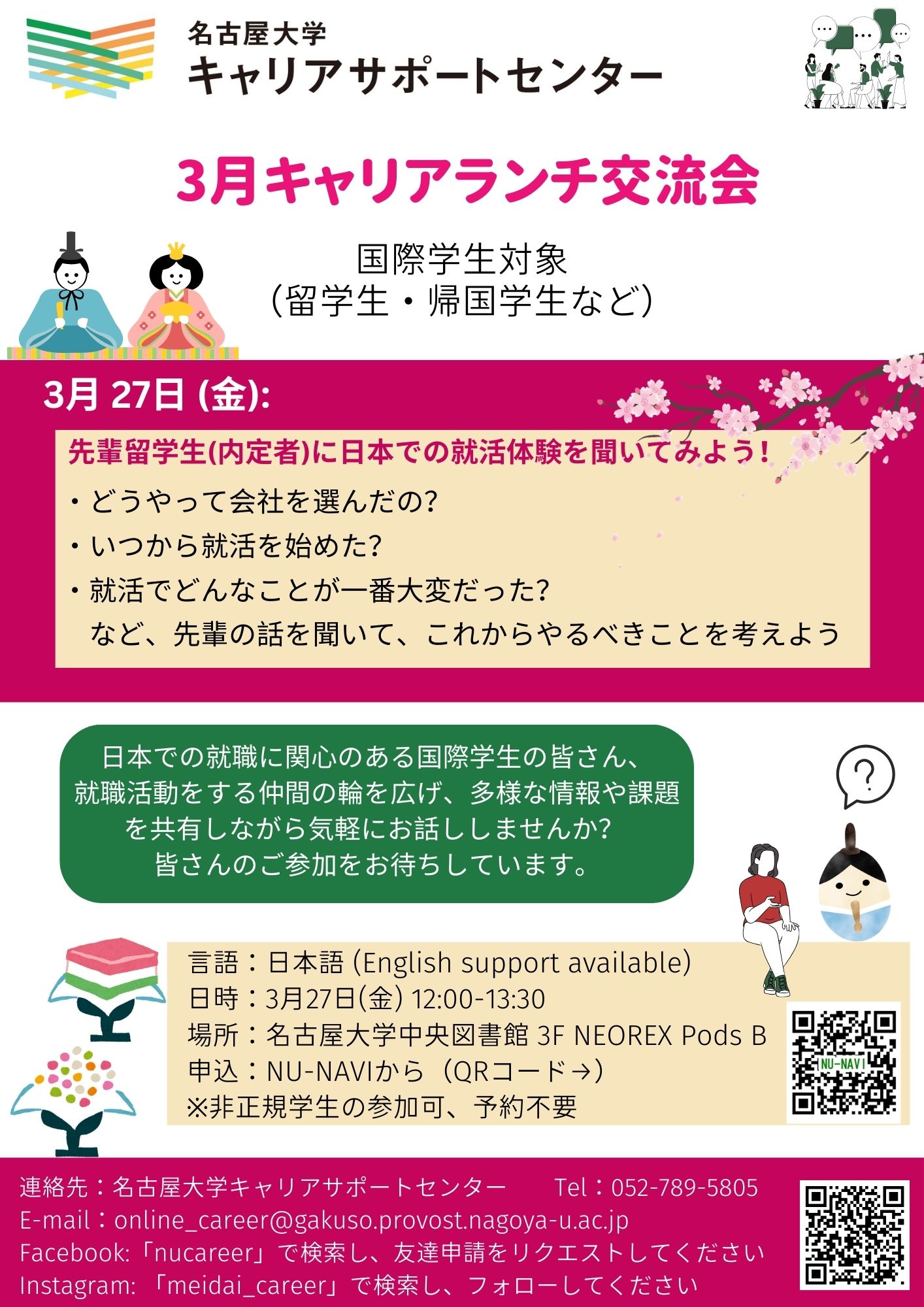 キャリアランチ交流会(3月) 2024.3.29 国際学生対象(留学生・帰国学生など)3月は内定者の先輩の話を聞きます! 3/27(金) 12:00~13:30中央図書館3F NEOREX Pods B