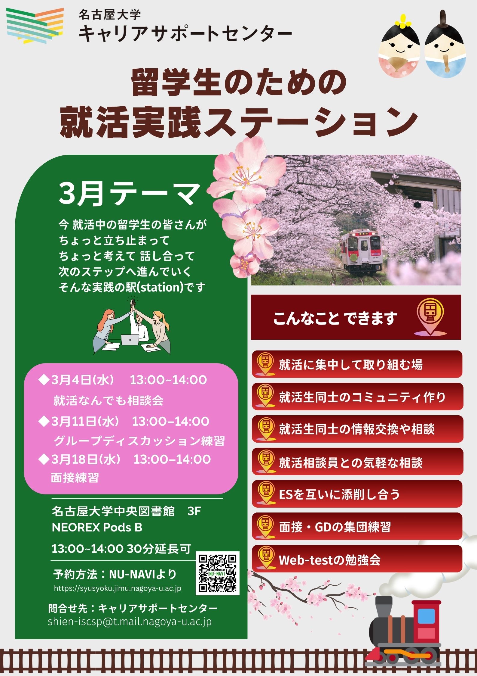 留学生のための就活実践ステーション(3月) 2024.9.13 3/4(水)・3/11(水)・3/18(水)13:00~14:00 中央図書館3F NEOREX Pods B3月は面接練習が中心!詳細はポスターを参照してください!