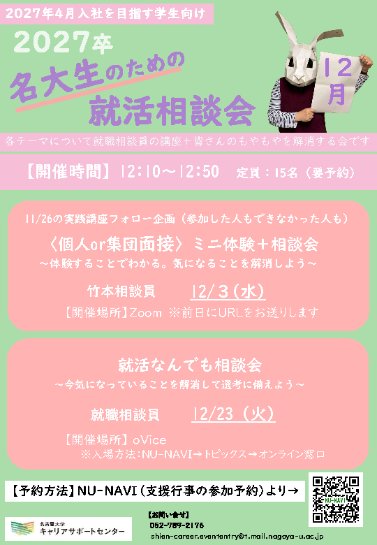 2027卒名大生のための就活相談会(12月) 2023.5.12 2027年4月入社を目指す学生向け12/3(水)(Zoom開催)面接ミニ体験12/23(火)(oVice開催)なんでも相談会12:10~12:50