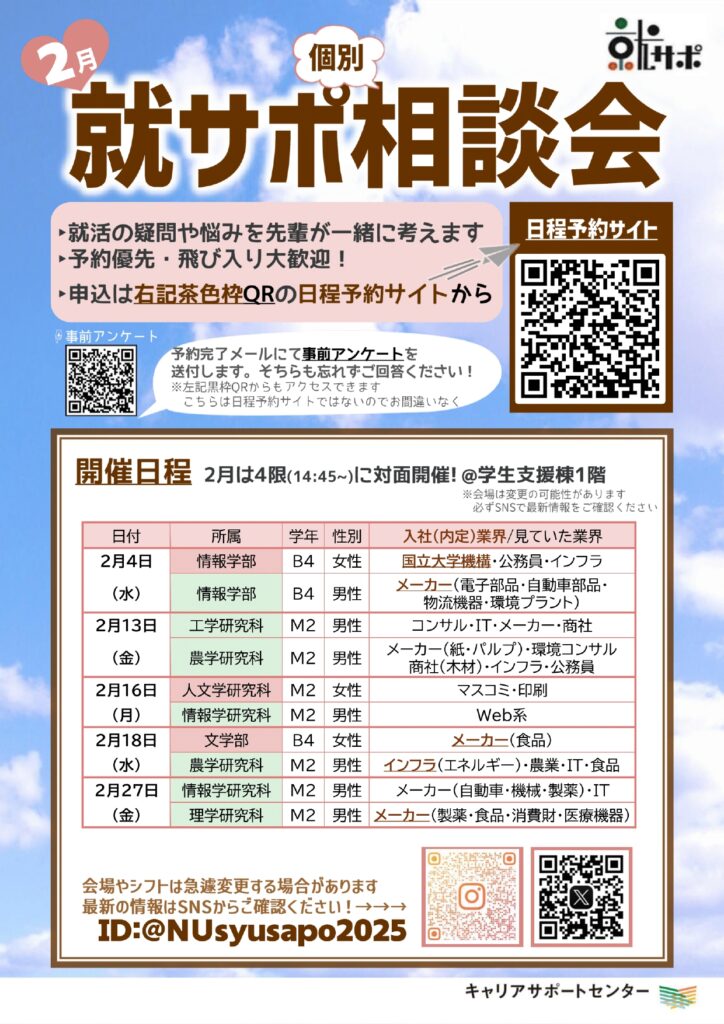 2026 Graduates’ Special Consulting 2026.1.29 Special career consulting times available for 2026 March Graduates! Feb.25(Wed), Mar.24(Tue), Mar.26(Thu)①14:45~ ②15:30~